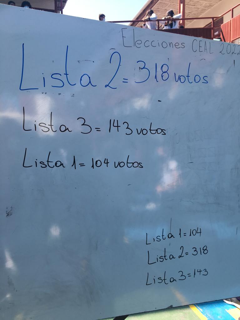 Con una gran participación del estudiantado se realizó el proceso de elecciones que incluyó conformación de listas , siendo tres las candidaturas, debates con los representantes de cada curso de séptimo a cuarto medio. Elecciones con la supervisión del TrIcel estudiantil y finalmente la lista 2 como ganadora con 318 votos. Seguidos de la lista 3 con 143 votos y lista 1 con 104 votos legítimamente emitidos. Felicitamos a todos nuestros estudiantes que con excelente disposición y ejerciendo su derecho a participación, lograron ser parte del proceso electoral. Además agradecer a la profesora Isidora Molina quien organizó y coordinó esta importante actividad como encargada del plan de formación ciudadana. Les deseamos lo mejor a nuestro nuevo gobierno estudiantil periodo 2022 -2023 , que la gestión sea de colaboración con las instancias de nuestro Liceo y aportemos al bienestar de todos los actores de la comunidad educativa. Un gran saludo fraterno en paz y bien.