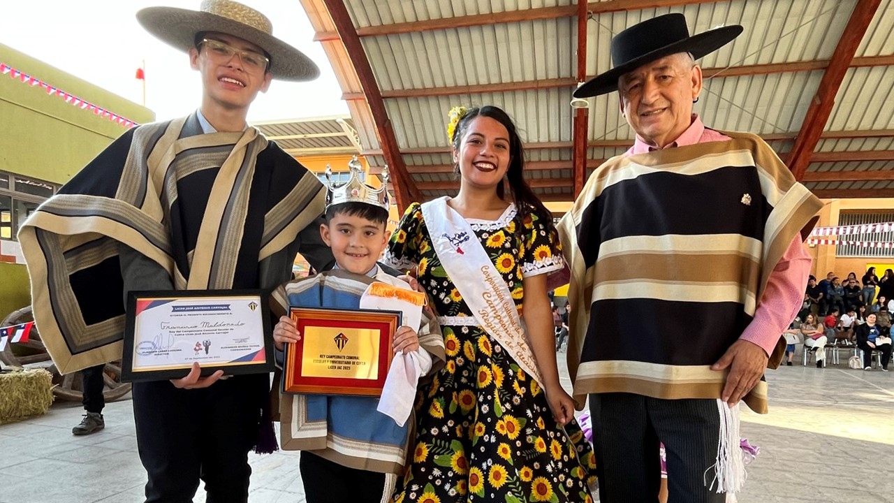 El día 07 de septiembre se realizó en campeonato comunal de cueca escolar y Universitaria en dependencias del Iiceo José Antonio Carvajal, en el que participaron alrededor de 45 parejas.  Nuestro Liceo, presentó una pareja en el ciclo Enseñanza Media, integrada por los alumnos Sofía Calderón y Renato Cabello, quienes tuvieron una destacada participación; y también presentó una pareja en el Primer Ciclo de Enseñanza Básica, Marina Castillo del 1° C y Juan Francisco Maldonado del 1° A, quienes obtuvieron el 1° Lugar (campeones escolares 2023) y además fueron coronados como Reina y Rey respectivamente (esto último fue elección de todos los bailarines que participaron del certamen).