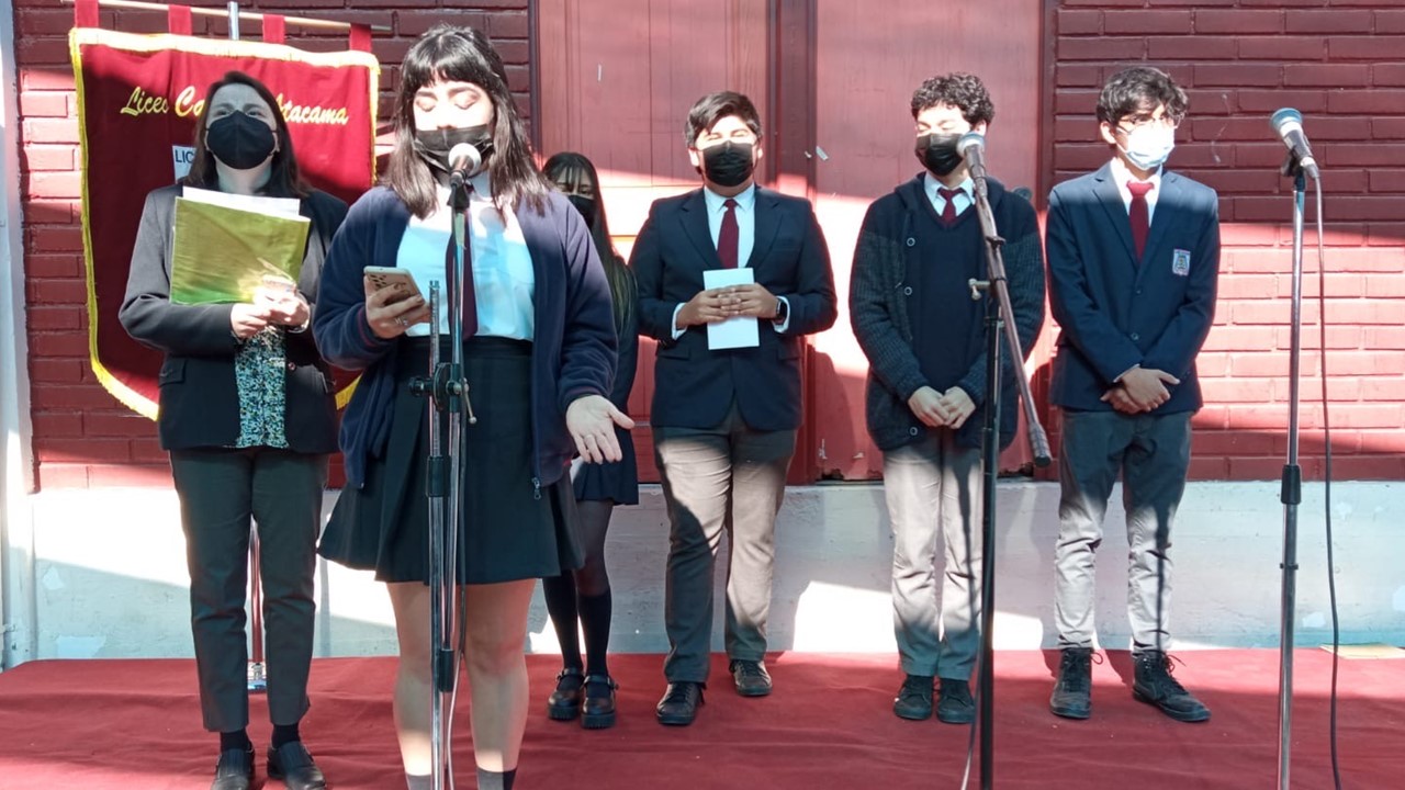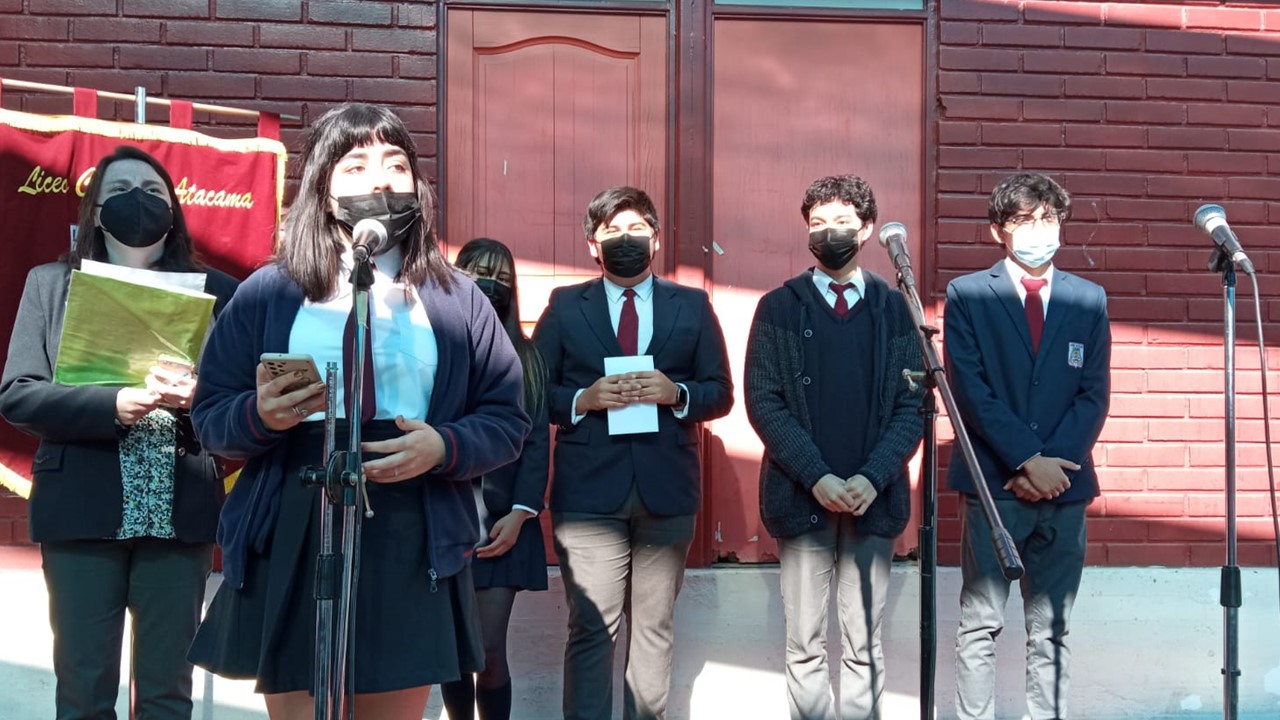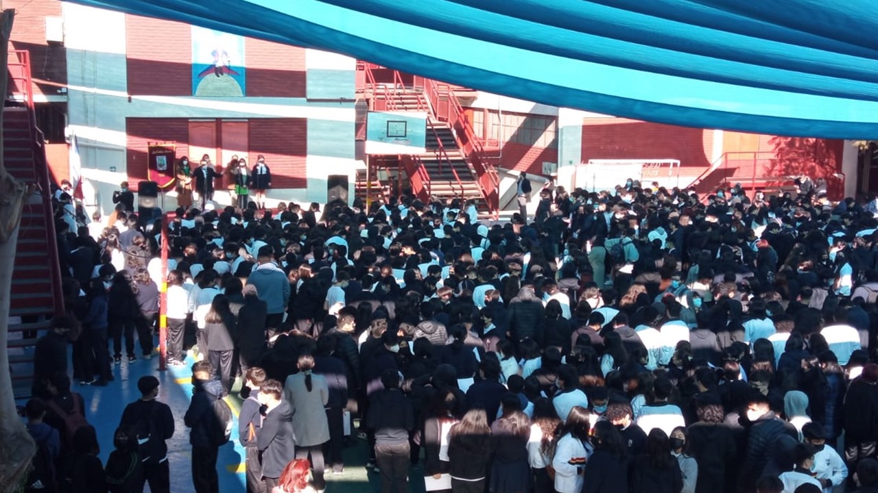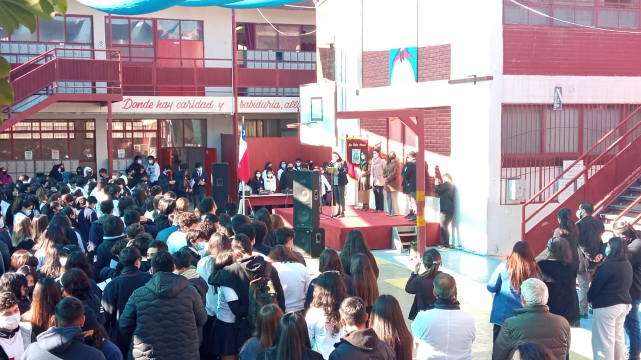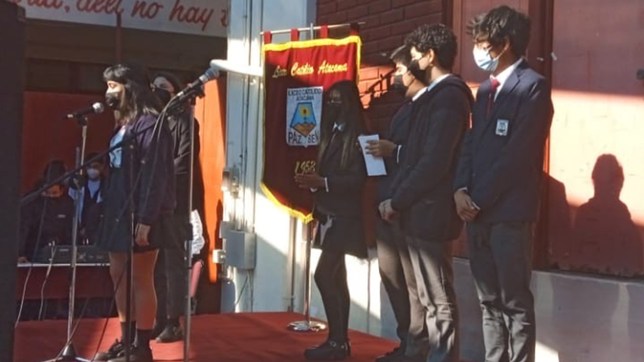 En el marco de inicio del segundo semestre, nos presentaremos ante nuestros estudiantes en un acto simbólico de recuperación de nuestra identidad como actores de la comunidad educativa, con todos nuestros signos de pertenencia de Liceo Católico Atacama, himno y estandarte. Con un mensaje de unión y oración instando a la protección de nuestro espacio educativo, fueron presentados todos quienes día a día ofrecen sus trabajos y profesionalismo en la tarea de educar y formar personas de bien. Con la participación de los docentes, equipo interdisciplinario, inspectores y representantes de los Centros de estudiantes presidenta Martina Grandón, del Centro de apoderados E. Media presidenta Sra. Claudia Garrido Labarca. Directora del Nivel Parvularia, Sra.Estrella Versalovic Marre y nuestra Rectora, Sra.Erna Fuenzalida Lazo, quien se dirigió a los estudiantes en un mensaje motivador para una mejor convivencia y recuperación de nuestro ideario institucional. Se cierra este significativo acto, con la entonación del Himno de nuestro Liceo Católico Atacama acompañado por la voz de nuestra estudiante Sofía Carvajal.